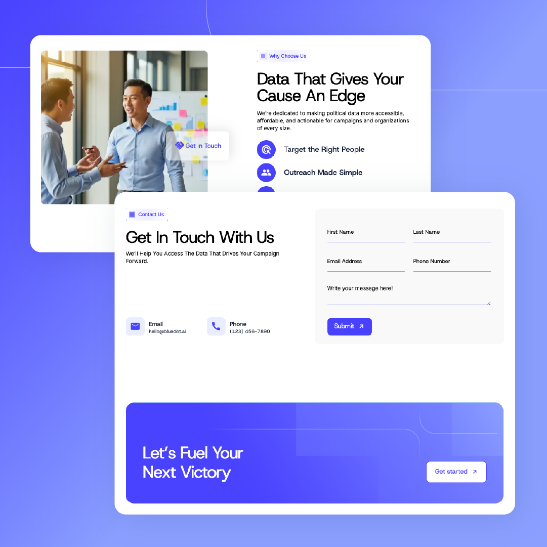 BlueDot Data needed to bridge two worlds: the precision of a tech company and the urgency of political campaigns. They lacked a defined identity. No logo, no color system, no tone, and no website direction. To stand out against established competitors, they needed a brand that felt modern, credible, and clearly aligned with the political arena. Everything from language to visuals had to be built from scratch.