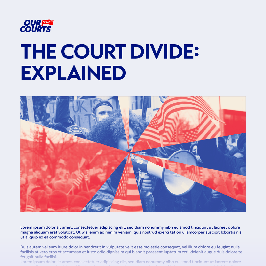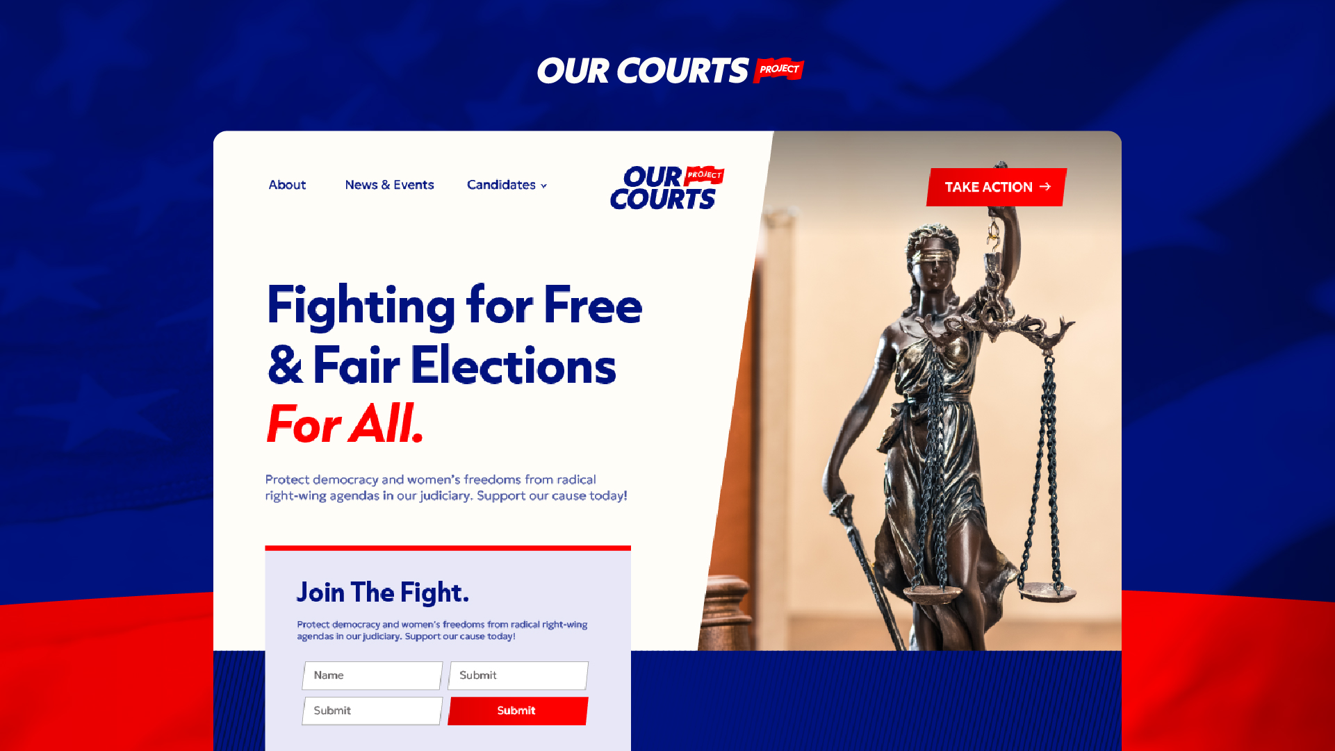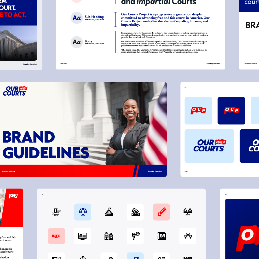We partnered with Our Courts Project to build a complete brand identity and custom website from the ground up. The visual identity was designed to feel civic, strong, and human. We combined bold type, patriotic tones, and inclusive messaging to reflect the nonpartisan nature of their mission.